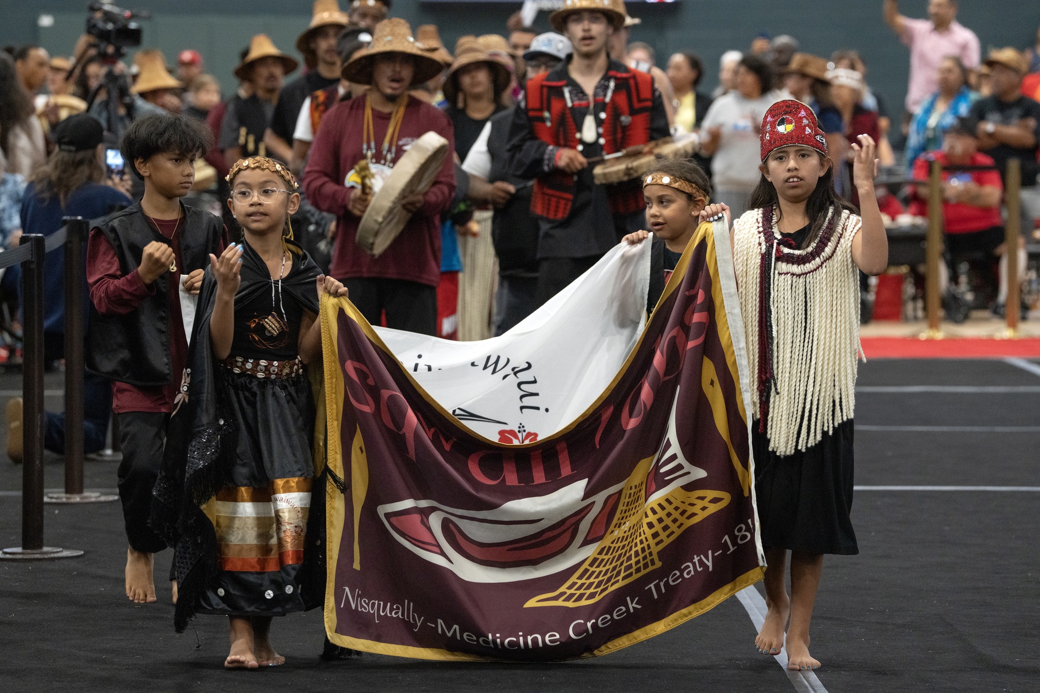 Nisqually (pronounced Nis-KWALL-ee) comes from the word squalli, meaning “prairie grass.” The Nisqually call themselves s’qwali? abš or Squalli-Absch, which means “people of the grass country” in the Salish language. The Nisqually’s traditional lands were the entire Nisqually River basin in western Washington state. They inhabited the coastal regions and woodlands from Puget Sound (Whulge) to Mount Rainer (Tacobet). Today they live on the Nisqually Reservation located by the Nisqually River in Thurston County. It lies on a 1-mile-wide (1.6-kilometer-wide) strip surrounded on both sides by America’s second-largest military base, Fort Lewis. Over the past 25 years, the tribe has acquired more than 1,000 additional acres on or near the reservation. The Nisqually thrived for thousands of years on the natural resources their vast tribal lands provided, sharing berry and hunting grounds with nearby tribes. They roamed the woodlands and coastal waters from Mt. Rainier to the Puget Sound. Their lives were ordered by finding food, feasting, and special rituals. Before the 1970s lack of electricity and other modern resources on the reservation caused most Nisqually to move from their tribal lands. Since then electricity has been introduced, and new buildings have gone up. Hundreds of Nisqually have come back to rebuild their culture and community.